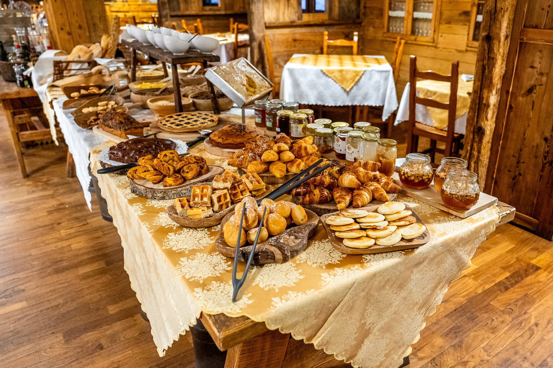 Inizia la giornata con il sapore della montagna del nostro buffet della colazione. Ogni mattina ti aspetta una ricca selezione di prodotti freschi e artigianali, pensati per soddisfare ogni palato. Che tu preferisca una colazione energica o un risveglio più dolce, il buffet della colazione del nostro ristorante a Gressoney è il modo perfetto per iniziare la giornata: dai dolci fatti in casa, passando per pane appena sfornato, un’ampia selezione di formaggi e salumi tipici della tradizione della Valle d’Aosta, marmellate locali e miele delle Alpi.
